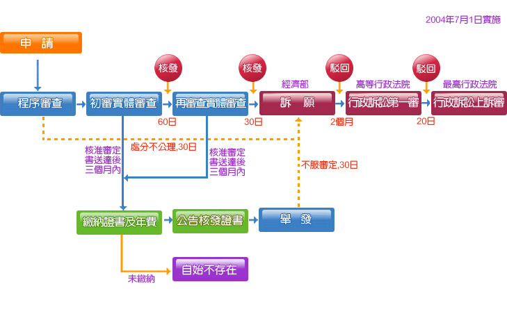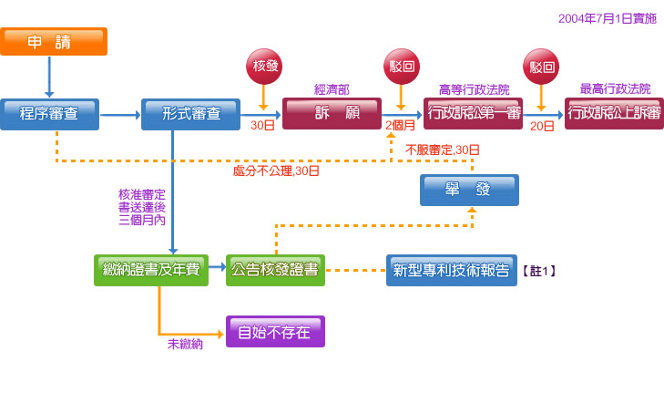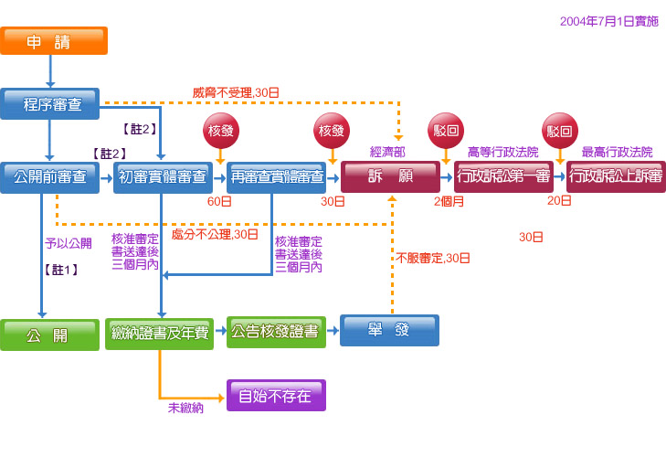 發明專利案審查及行政救濟流程圖 【註1】發明專利申請案,起審查認無不合規定程式且無應不予公開之情是者,自申請日(有主張優先權者, 自最早優先權之次日) 起十八個月後公開之。 【註2】發明專利申請案,自申請日起三年內,任何人均得申請實體審查,始進入實體審查。 新型專利案審查及行政救濟流程圖 【註1】新型專利經公告後,任何人均得申請新型專利技術報告。 設計專利案審查及行政救濟流程圖
